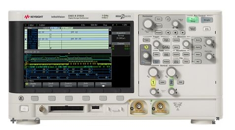 The MSOX3102T, 1 GHz oscilloscope provides 2 analog plus 16 digital channels, 4 Mpts memory, 1,000,000 waveforms/sec update rate and standard touch zone trigger with an 8.5-in capacitive touch screen.